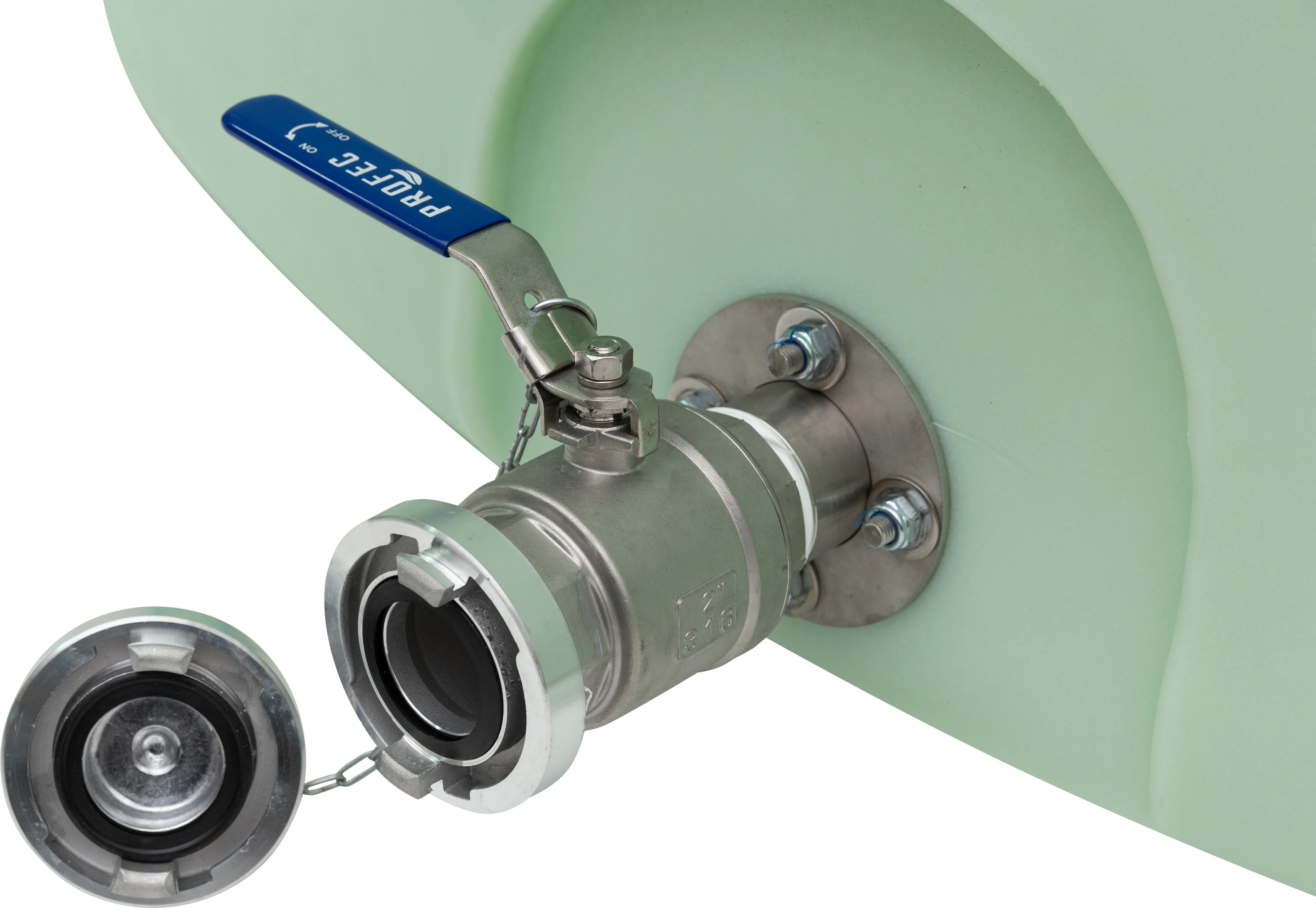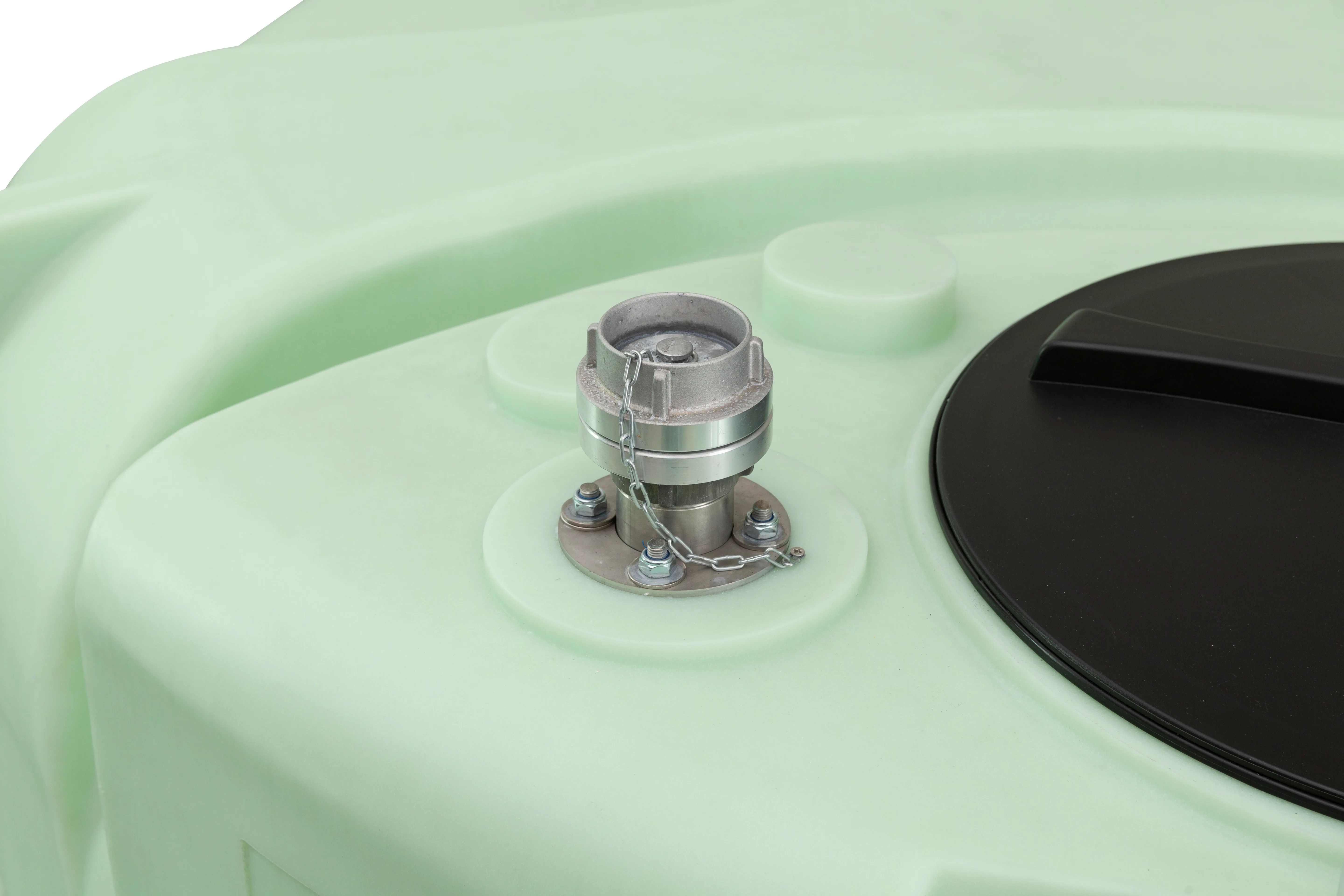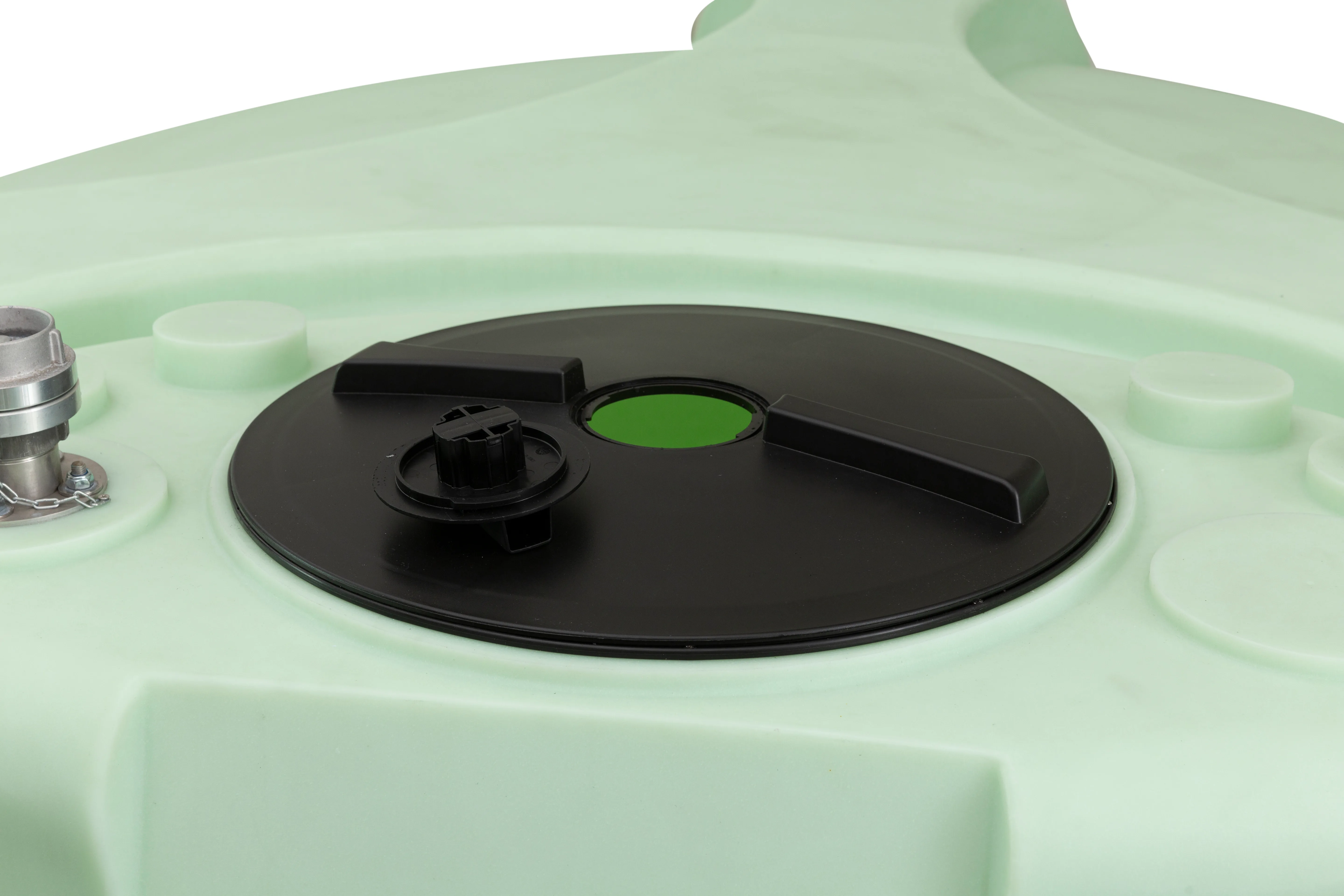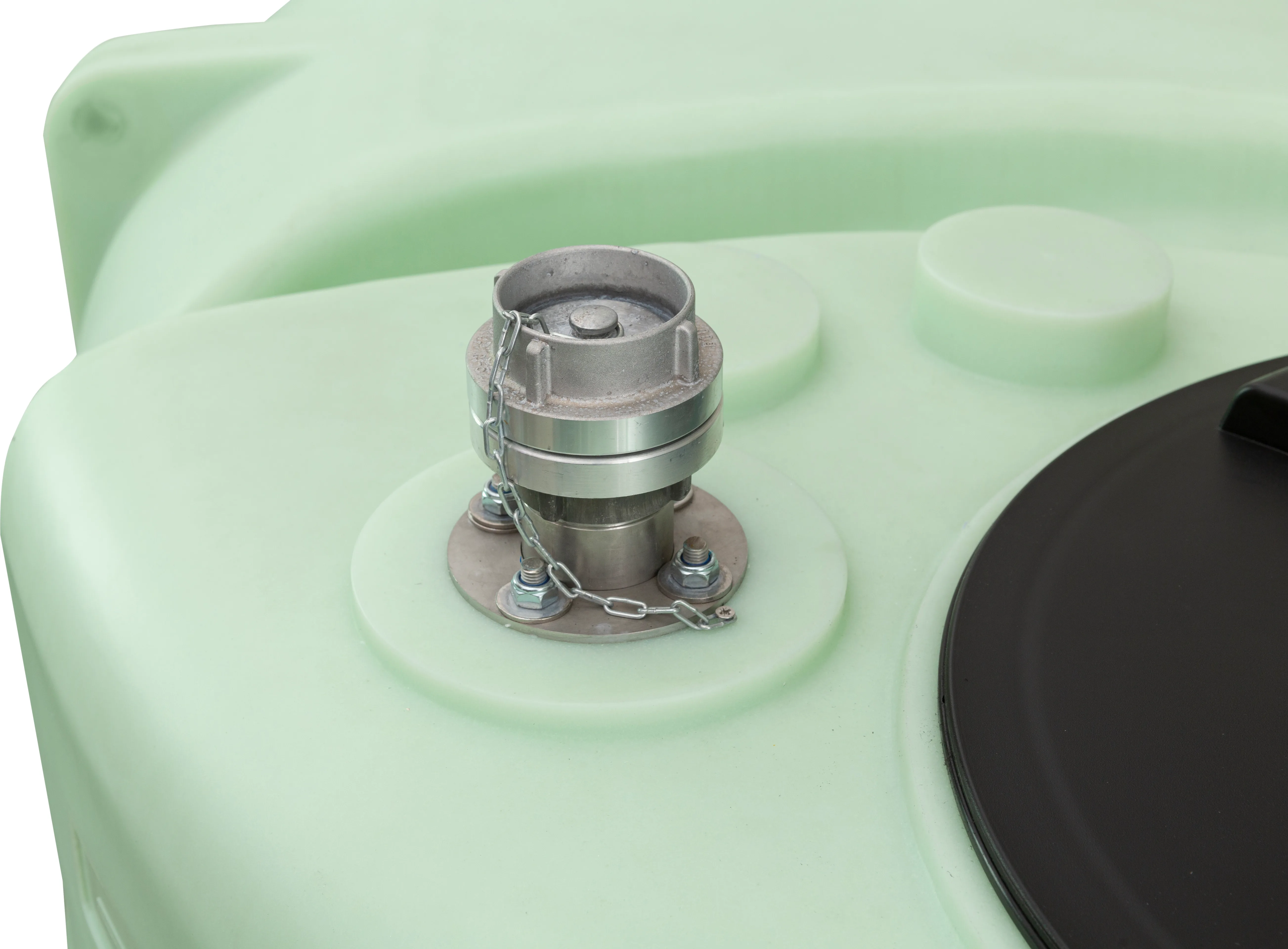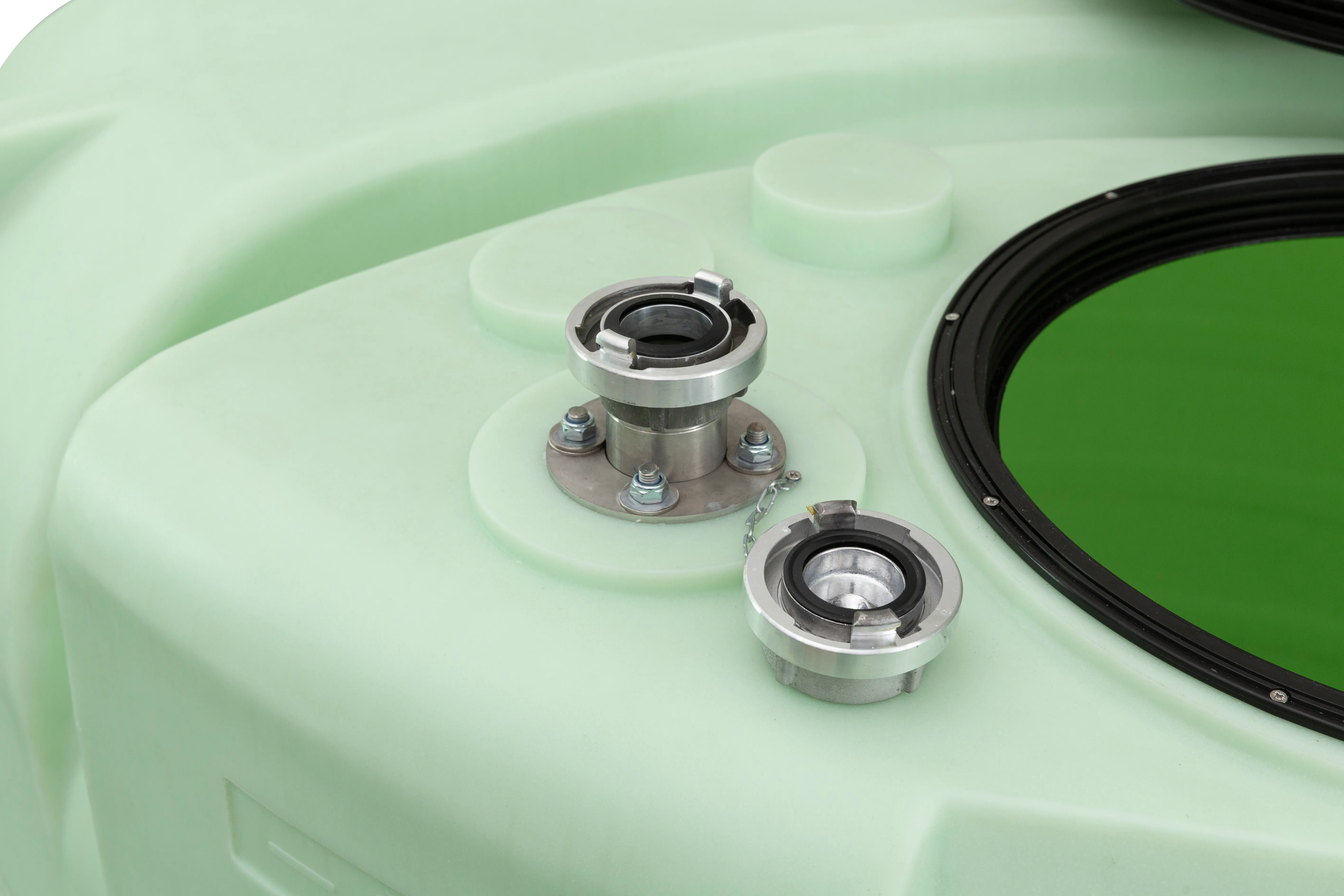 - —2 collu nerūsējošā tērauda uzpildes caurule ar STORZ alumīnija savienojumu tvertnes augšpusē